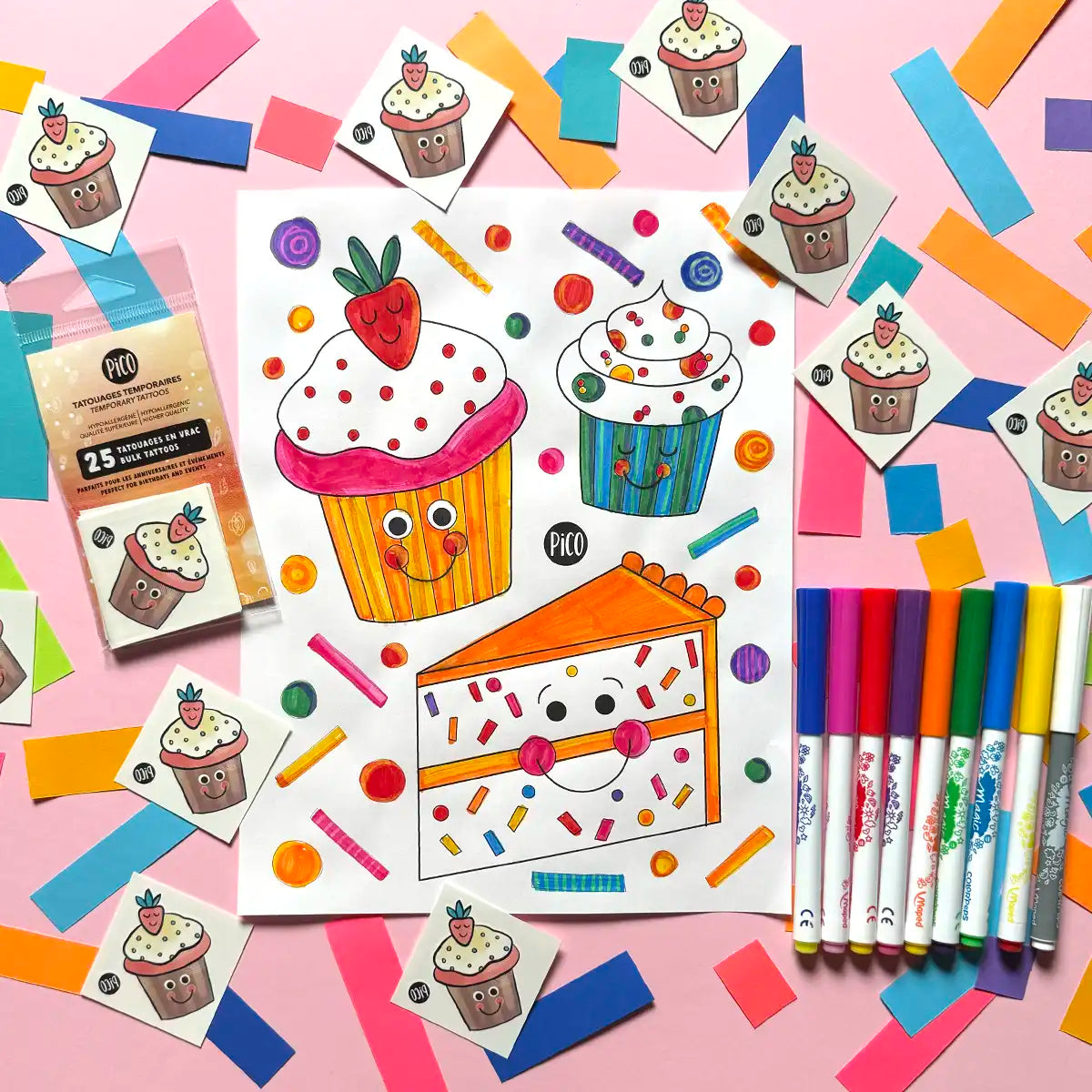 Laisse aller votre créativité avec ce coloriage gratuit d'amusants cupcakes aux décorations appétissantes ! Que ce soit pour un anniversaire, une fête d'école ou simplement une activité créative à la maison, ce coloriage saura faire plaisir les petits artistes de tout âge. Simple à imprimer en quelques clics, il transforme chaque moment en une joyeuse célébration pleine de gourmandise. Pour compléter la fête, découvre aussi nos tatouages temporaires assortis sur le thème des d'anniversaires, parfaits pour décorer les petits bras le temps d'une belle journée de célébration !!