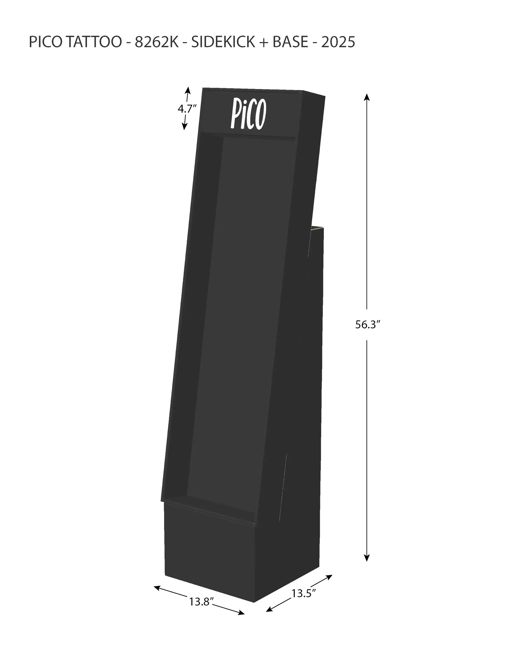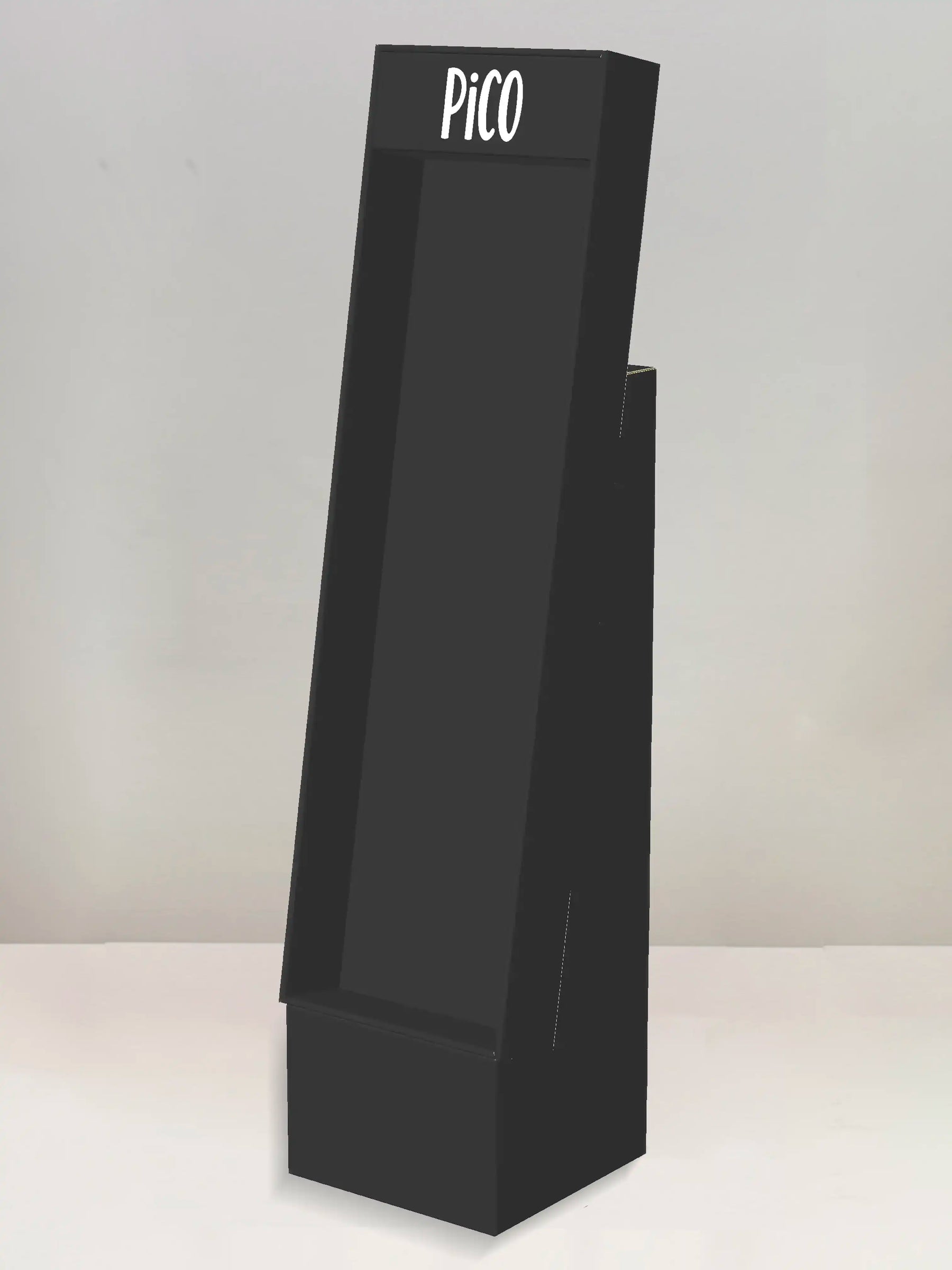 Présentoir en carton autoportant de plancher avec base stable et logo PiCO. Peut aussi être installer en bout de rangé ou au mur. Comprends 20 espaces pour installer les tatouages ou des cartes de souhaits. Un présentoir par boutique.